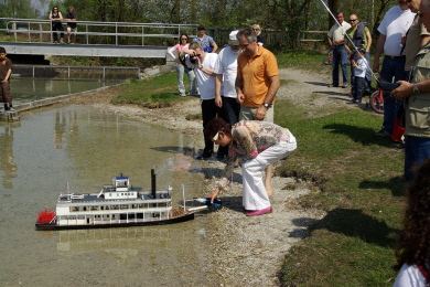 Die Krönung des Steamboat Aufbaus ist das Pilothaus. Auf dem höchstem Punkt des Schiffes damit der Pilot (Steuermann) den größtmöglichen Überblick hatte.. Auch das Pilothaus bekam seine Ausstattung. Für das Pilotwheel fielen allein 20 Arbeitsstunden an. Ein Sofa, Ofen und viele Steuergeräte wurden eingebaut. Am Bug ist ein Mast für die Beladung und um die Stage in Position zu bringen. In die Schlote baute ich Verdampfer ein, denn nichts geht über ein Model am See wenn es ordentlich raucht. Viele Figuren und Ausrüstungs Gegenstände, wie Fässer, Kisten, Heuballen, Säcke, Rettungsboote und Holzstapel vervollständigen dieses Modell.